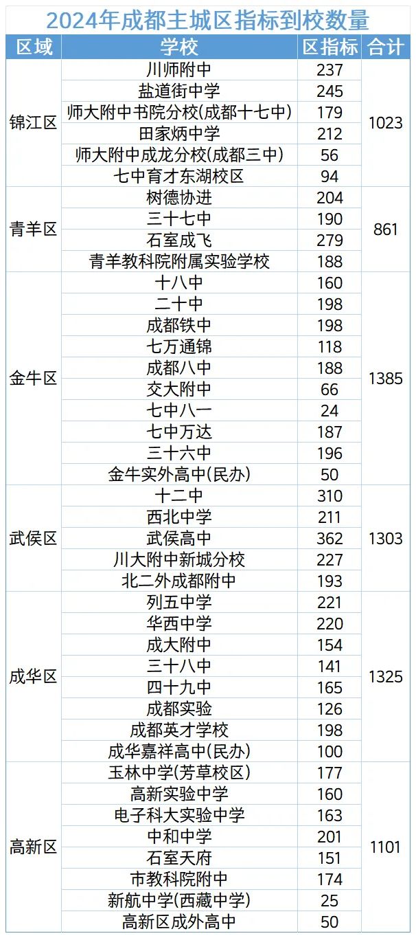 成都重点高中将统招计划50%名额分配到各初中,2024年部分区域指标比例进一步提升。