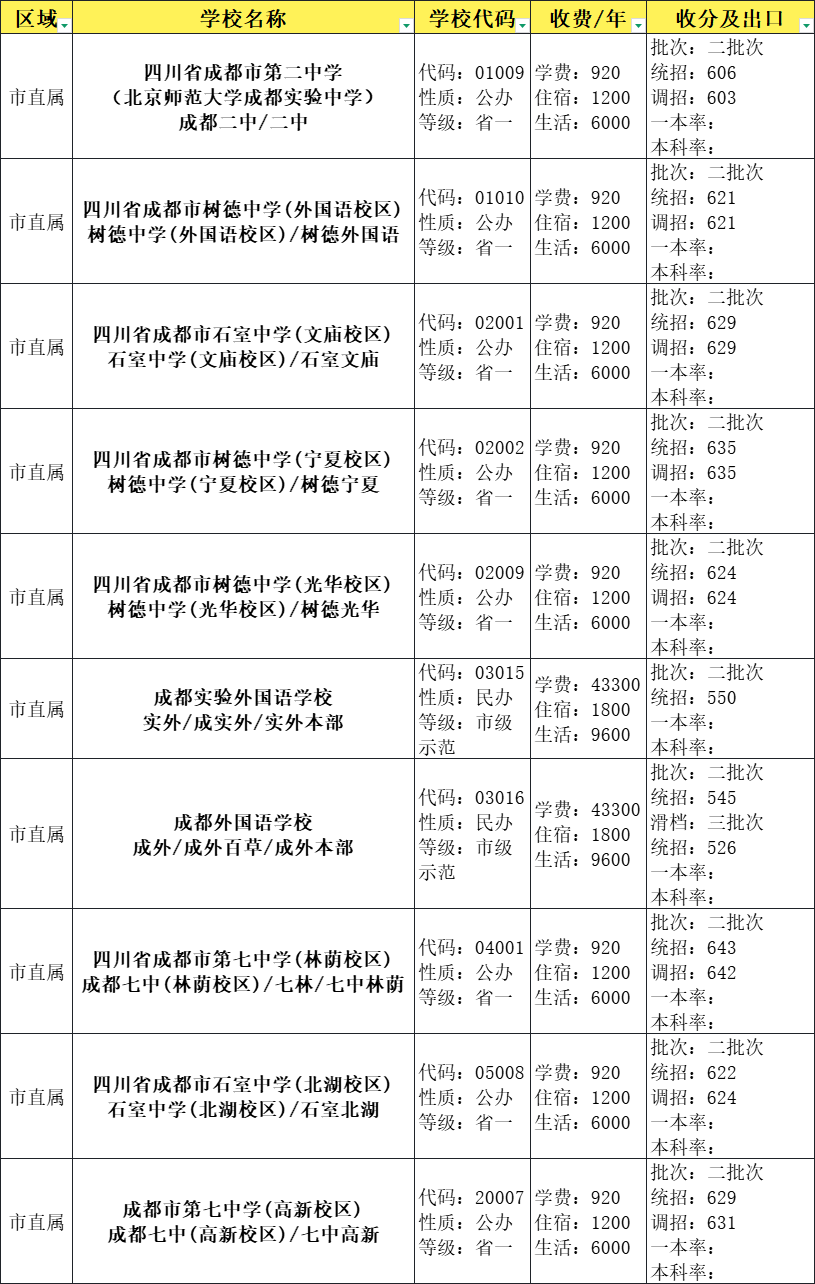 成都十二中(川大附中)619分,七中万达610分,成飞中学583分。